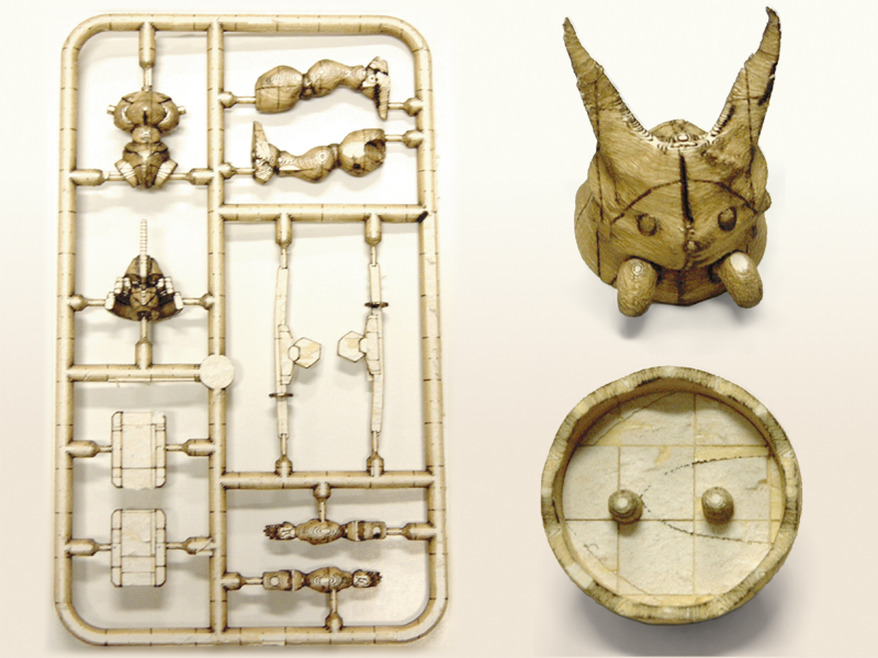 ここでは「紙」を使った紙積層造型法を試してみました。薄い紙を一枚一枚レーザーで切り、幾重にも重ねて作り上げます。